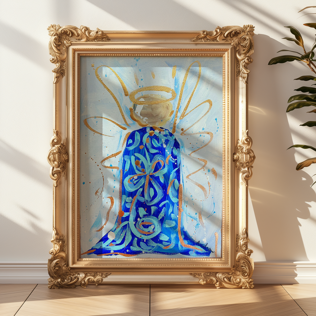 Blue White Angel Print, Christian Art, Dopamine Decor, Trendy Colorful Wall Poster, Maximalist Home
