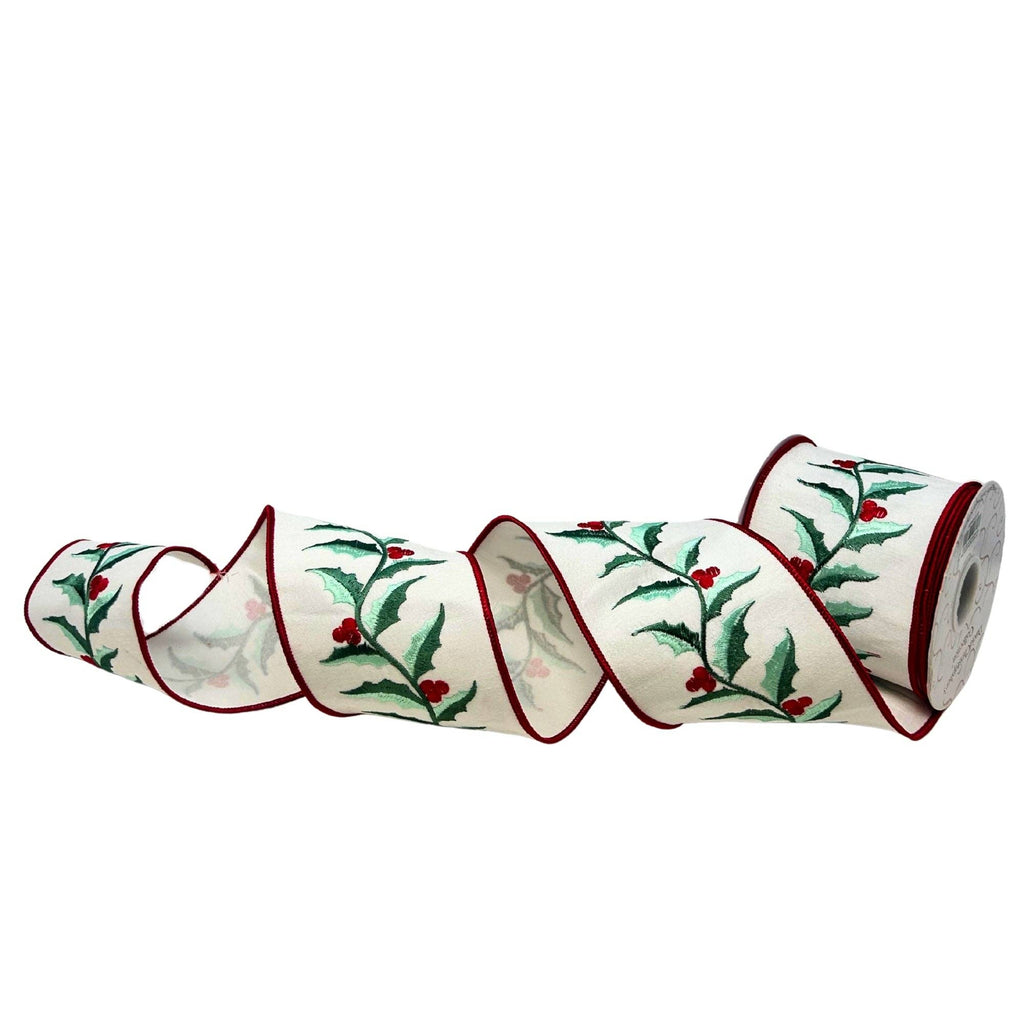 Sage Holly Leaves on White Faux Dupioni Ribbon 4" x 10yd